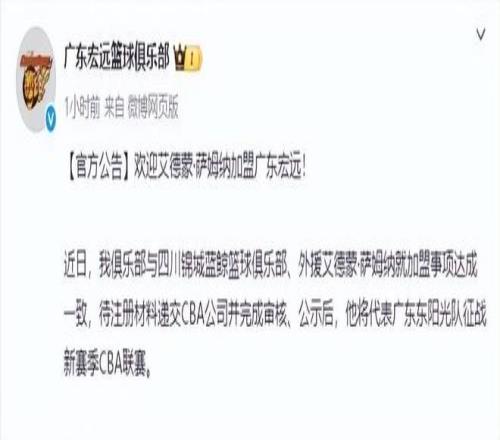 廣東男籃新賽季的陣容基本上已經(jīng)確定,目前廣東男籃最為期待的,就是傳說中的“奶茶哥”薩姆納也能加盟球隊。就在剛剛,這件事有了確切的消息:先是四川男籃官宣,將薩姆納的優(yōu)先續(xù)約權(quán)交易給了廣東男籃,接著CBA官方也公布了這個消息,最后廣東男籃發(fā)布官宣,歡迎薩姆納正式加盟球隊。